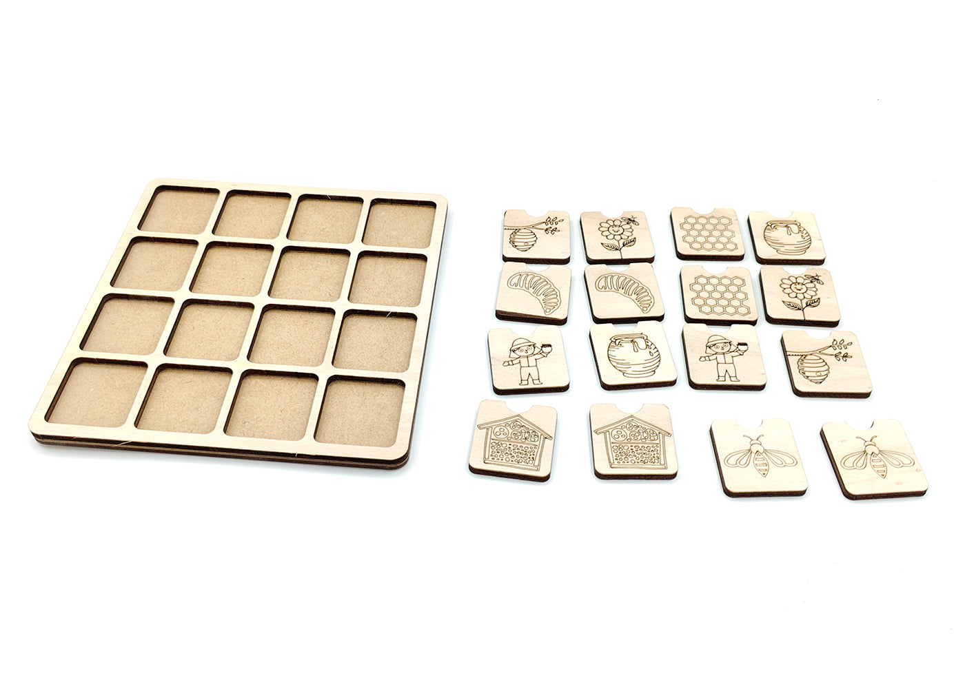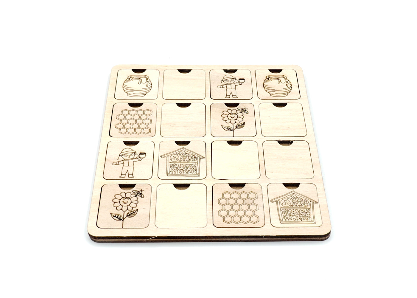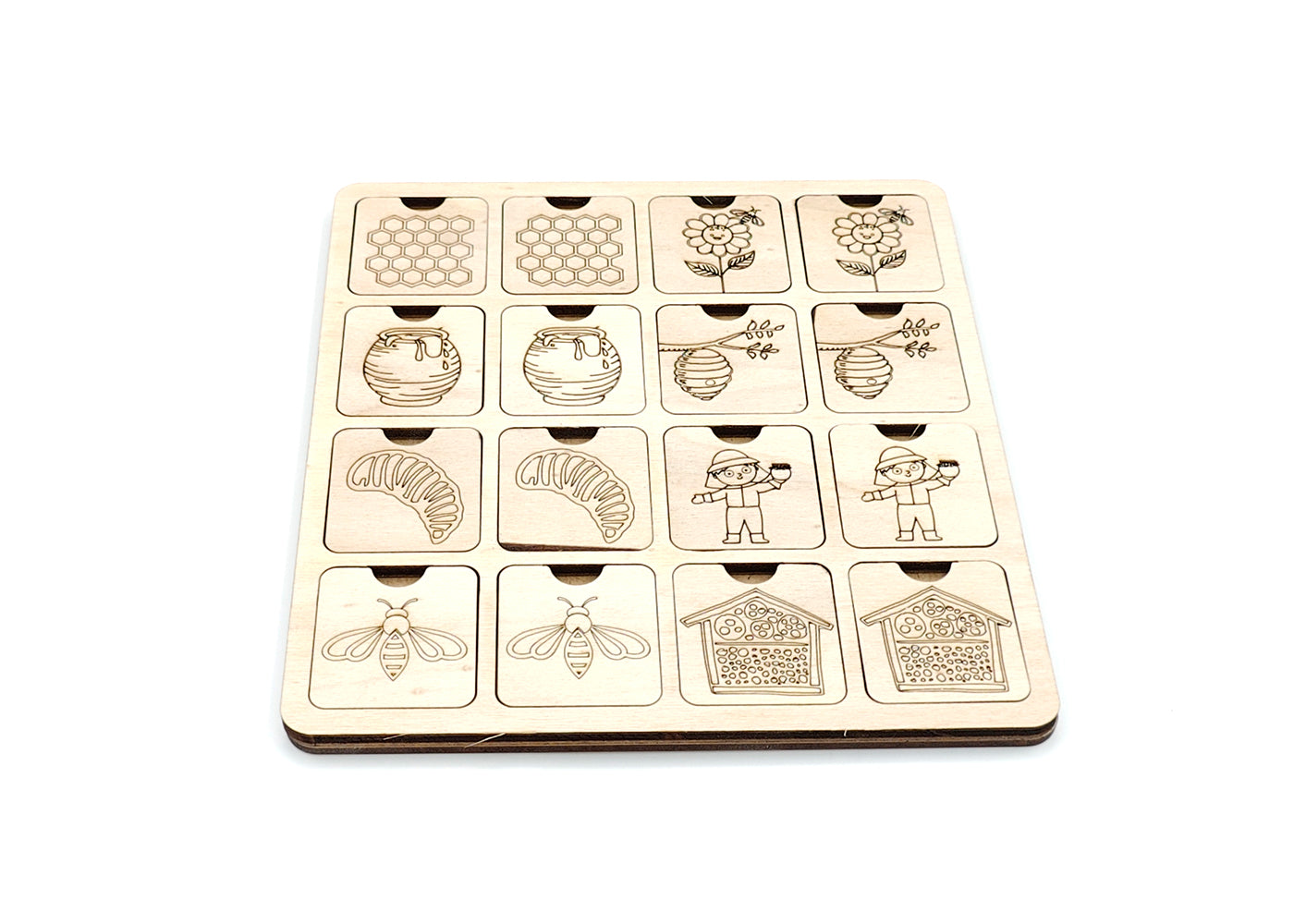 Jeu de motricité fine concernant l'orientation spatiale et la mémoire. Placez toutes les cartes face cachée sur le plateau de jeu. Le premier joueur prend 2 cartes. Si vous avez pris 2 cartes identiques, vous marquez un point et les mettez de côté. Sinon, vous les remettez et c'est au tour du joueur suivant. Essayez de vider complètement le plateau de jeu.