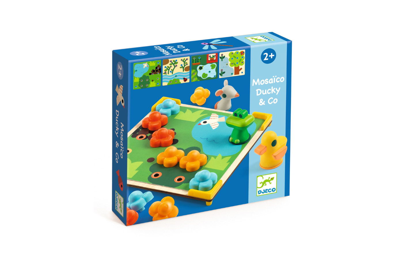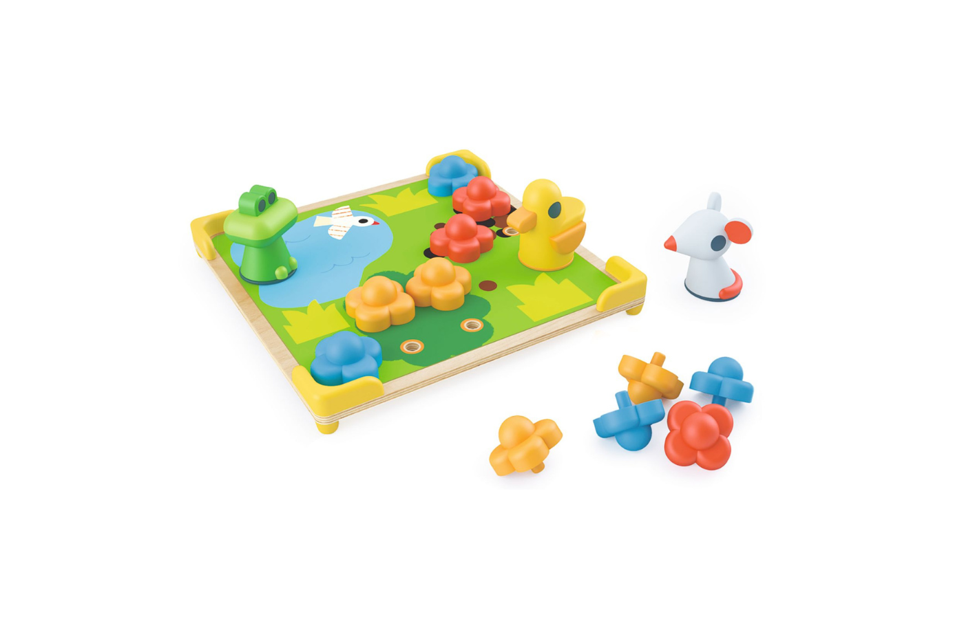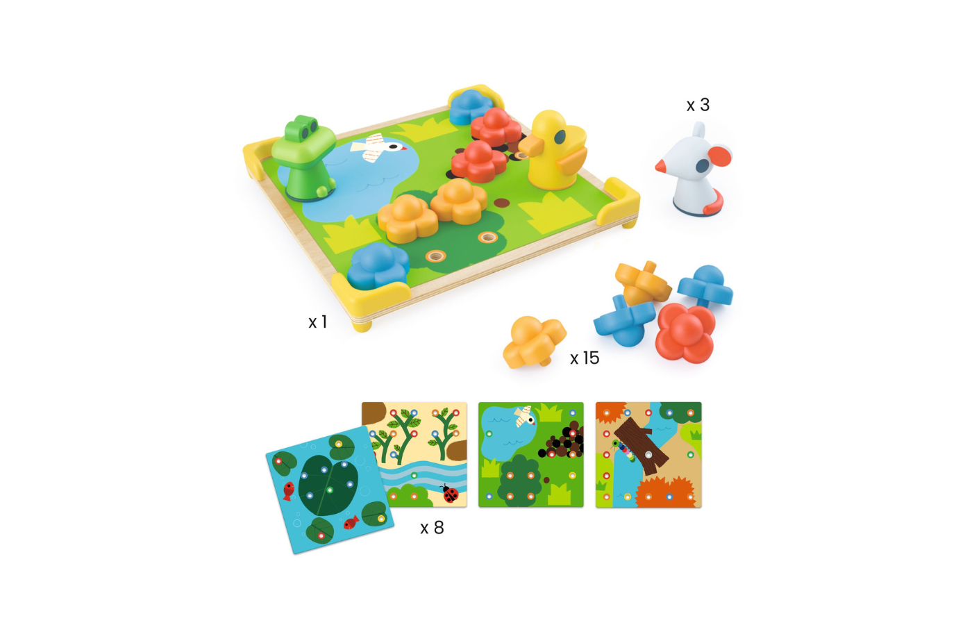 Avec ce puzzle mosaïque Mosaïco Ducky & Co, les jeunes enfants créent de petites scènes de fleurs et d'animaux. Placez l'un des gabarits sur la planche en bois et placez les fleurs et les animaux avec les picots au bon endroit. Les couleurs des fleurs et des animaux sont déjà indiquées sur les gabarits pour aider les enfants dans leur recherche.