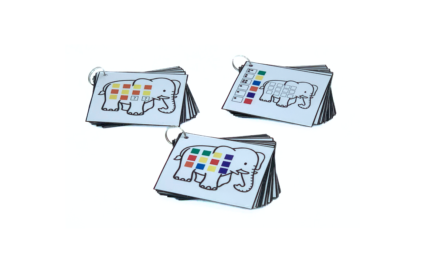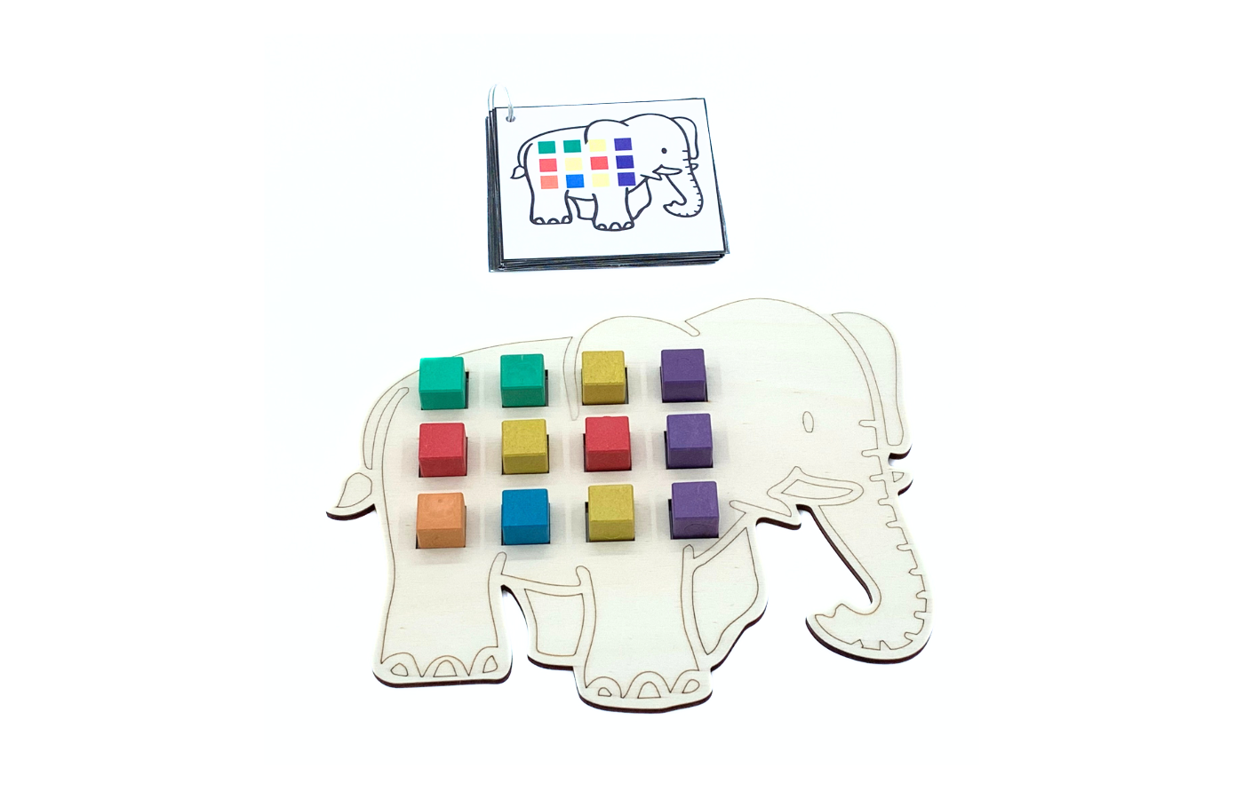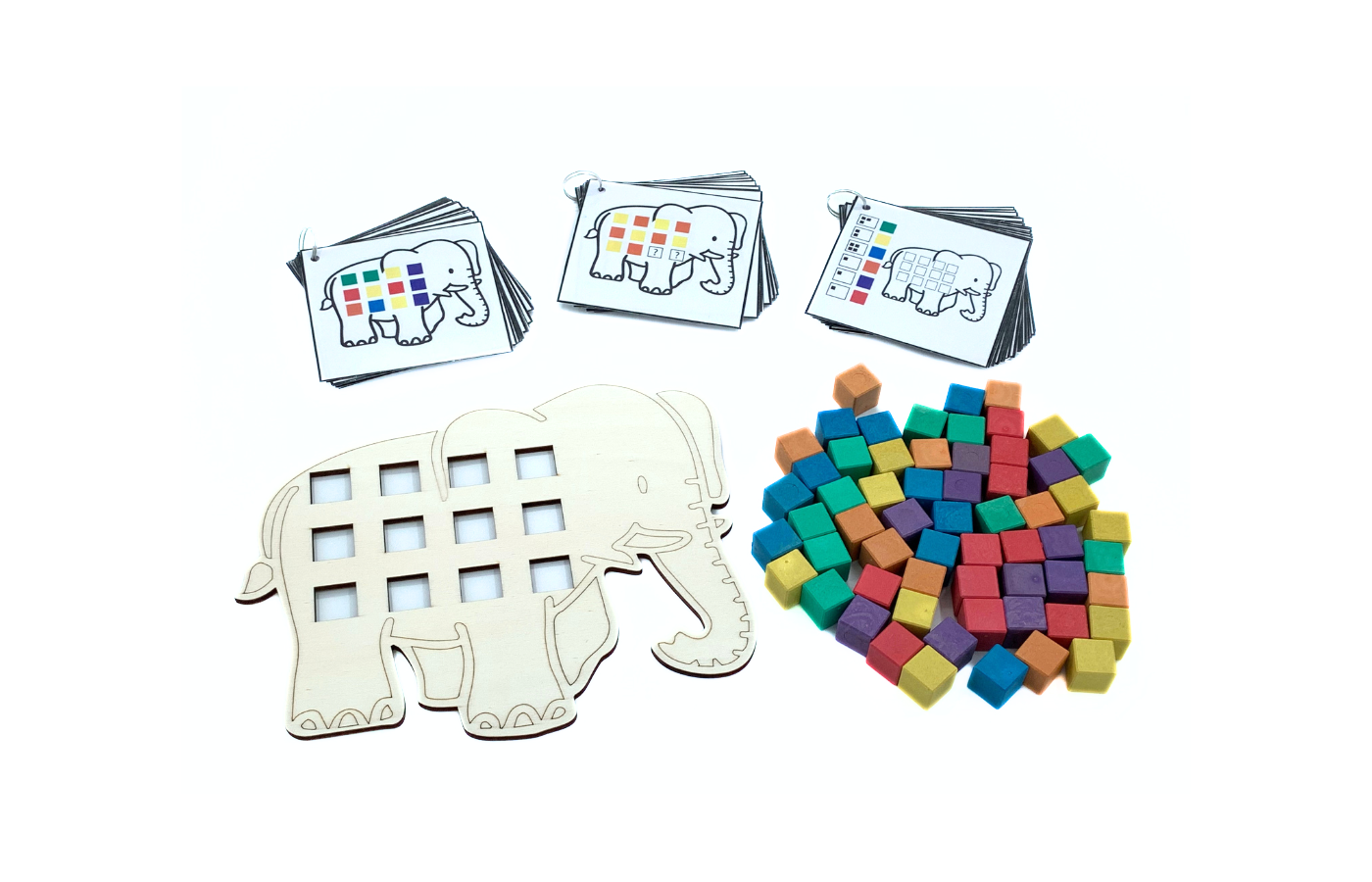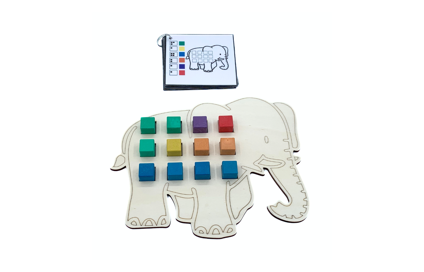 Jeu concernant l'orientation spatiale et le calcul. Les enfants classent les blocs colorés sur l'éléphant. La différenciation est intégrée dans les 90 cartes de tâches. (à imprimer et à plastifier soi-même). Il y a 3 versions de cartes de tâches (orientation spatiale et calcul). Comprend 60 blocs colorés (rouge, jaune, vert, bleu, orange et violet).