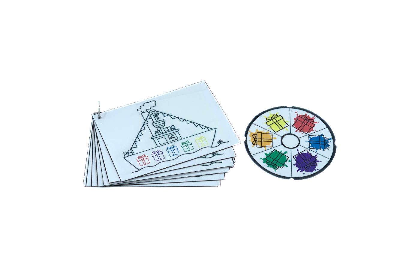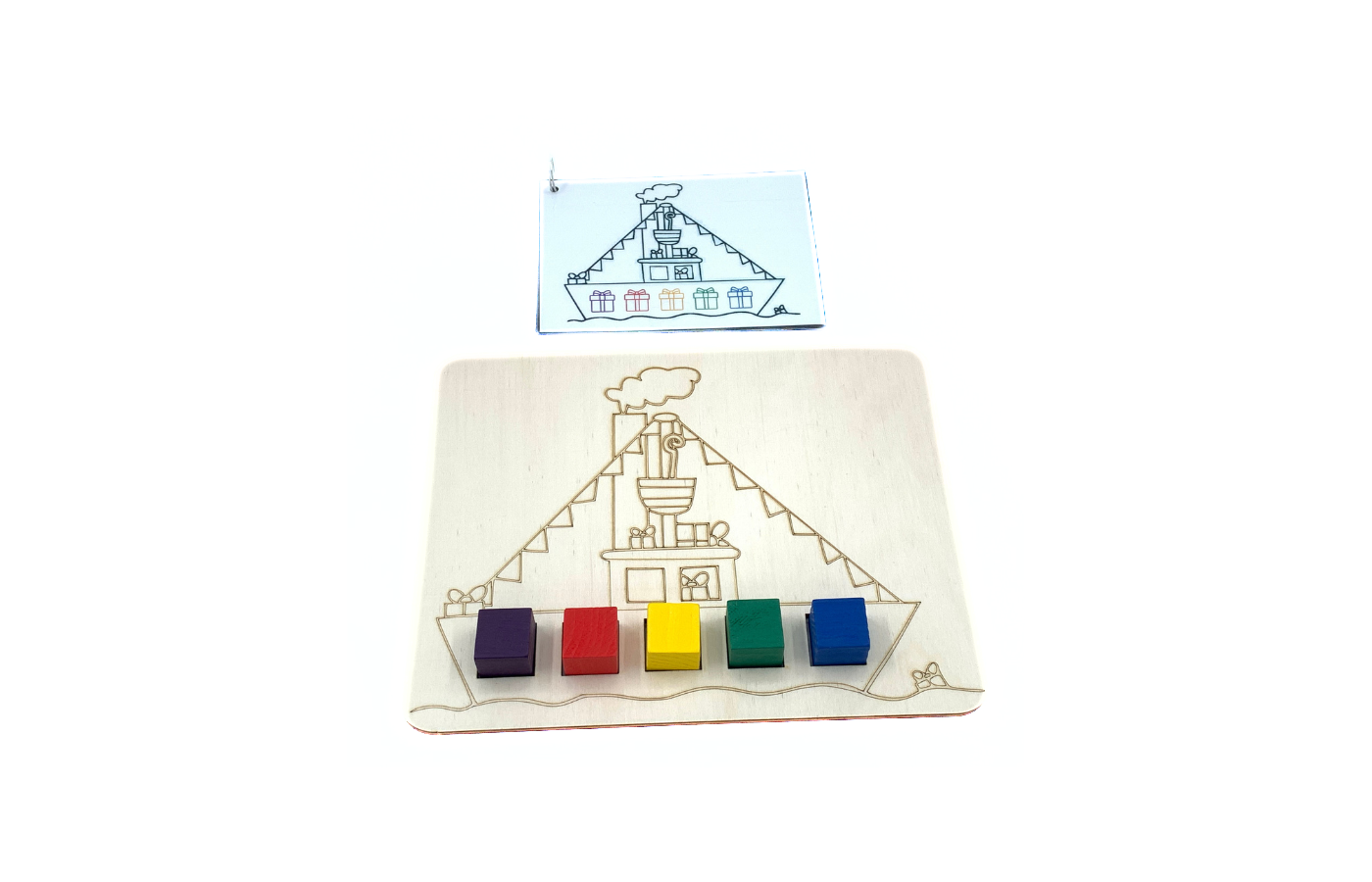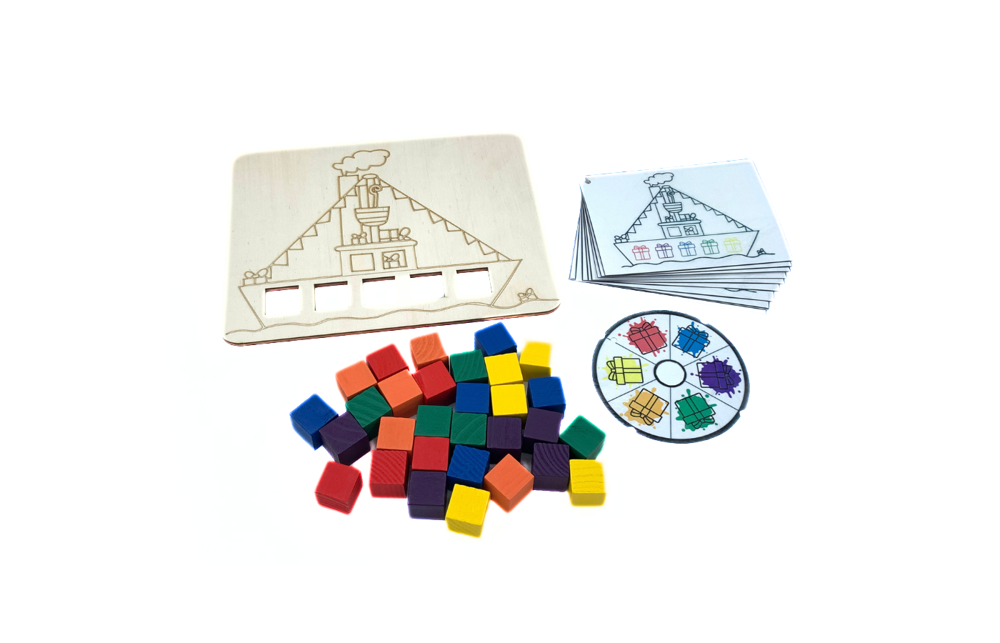 Jeu de motricité fine en rapport avec l'orientation spatiale. Peux-tu aider Saint et Pierre à organiser les paquets dans le bateau ? Les enfants placent les petits cubes en bois colorés dans les trous carrés. Cela peut également se faire sur la base de (25) cartes de mission. Une forme de jeu supplémentaire est également possible avec la carte Cspinner. Pour ce plateau de jeu, les mêmes blocs que pour le plateau de jeu emballage de cadeaux et sac à jouets sont utilisés. La différenciation est intégrée dans les cartes de mission (impression, découpe et laminage soi-même).