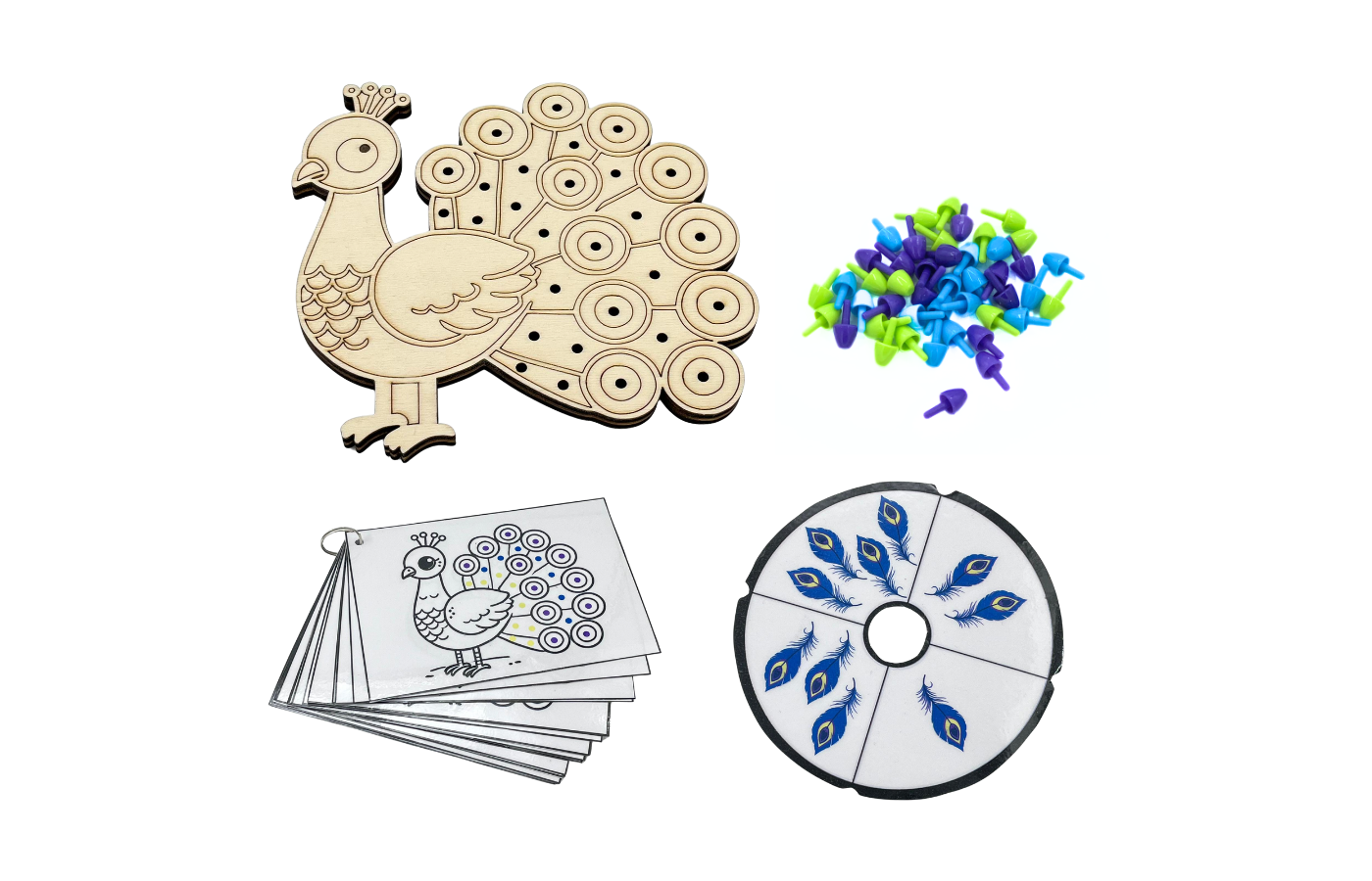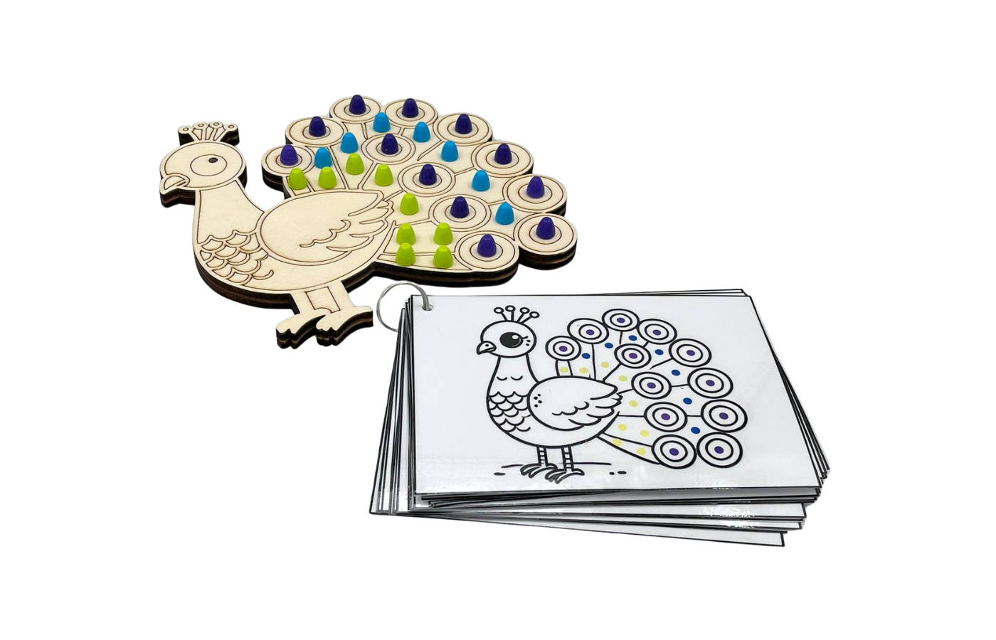 Rendez au paon ses belles couleurs ! Jeu lié à l'orientation spatiale et à la motricité fine. Les enfants organisent les perles colorées sur le paon en fonction des cartes de mission. La différenciation est intégrée dans les 20 cartes de mission. (à imprimer et à plastifier soi-même). Il est bien sûr également possible de faire une création libre. Inclus 45 perles colorées (violet, bleu et vert).