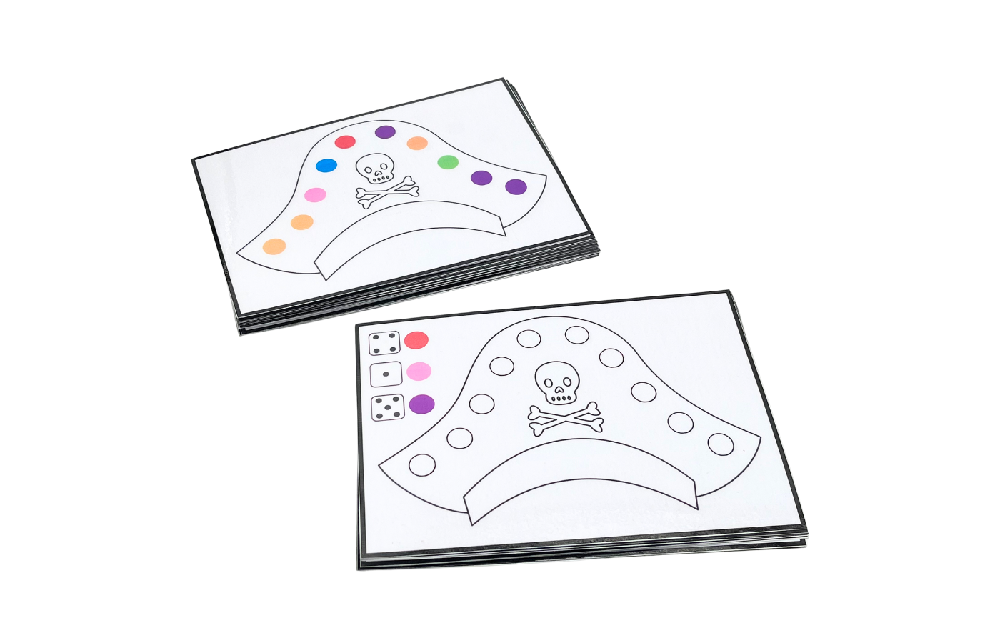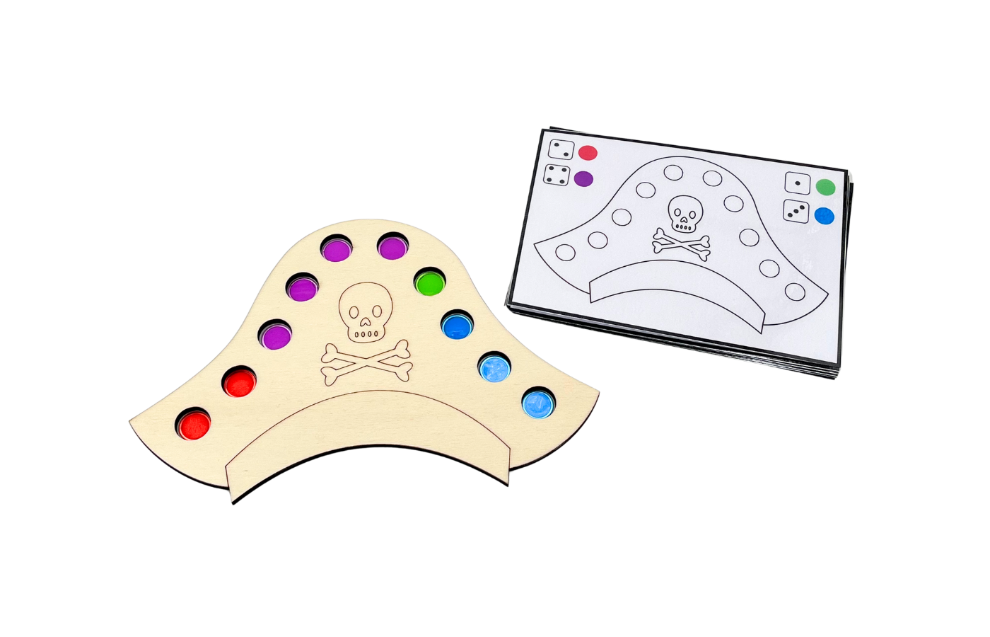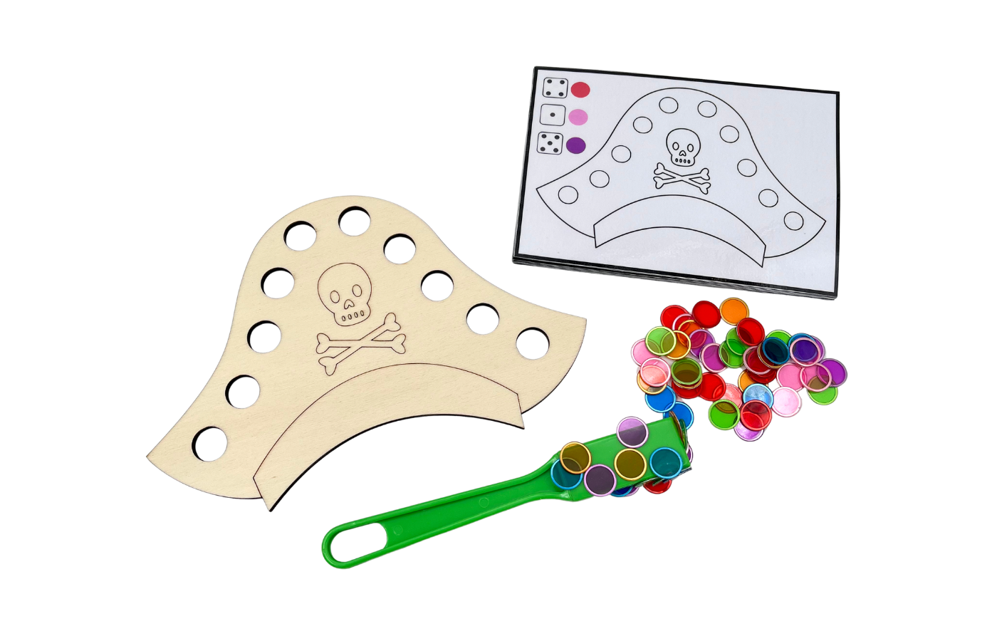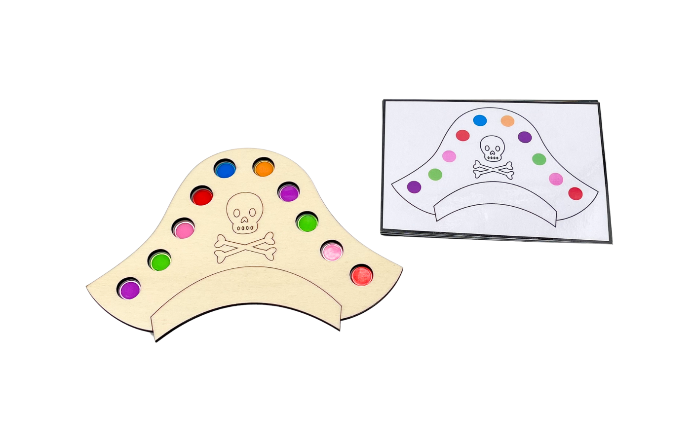 Jeu de motricité fine lié à l'orientation spatiale et aux mathématiques. Les enfants placent des jetons magnétiques dans les trous du chapeau de pirate, en suivant une carte de tâche. À l'aide du bâtonnet magnétique, ils peuvent retirer les jetons du plateau de jeu de manière ludique.