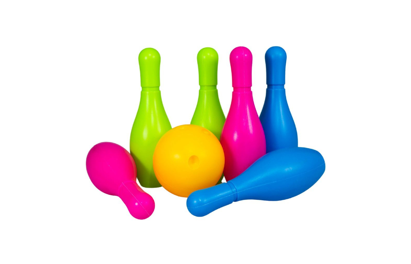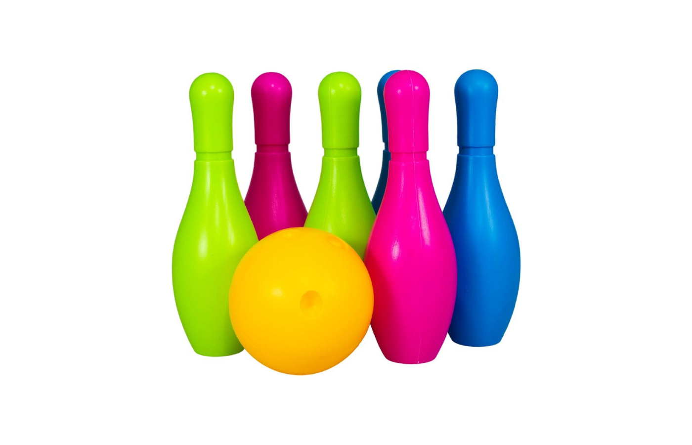 Set de bowling, composé de 6 quilles de couleurs rose, bleu, vert et d'une boule jaune. Équipé d'un cadre de rangement pratique.