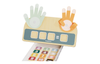 Twee zachte vilten handen met klittenbandsluitingen maken het mogelijk om vingers los te bevestigen en tellen visueel te maken. In combinatie met de houten cijferblokjes en dubbelzijdige opgavekaartjes leren kinderen optellen en aftrekken op een concrete en begrijpelijke manier.