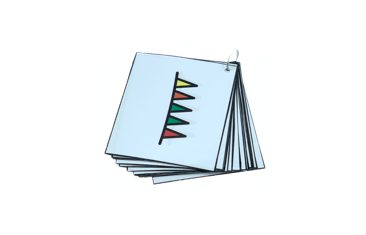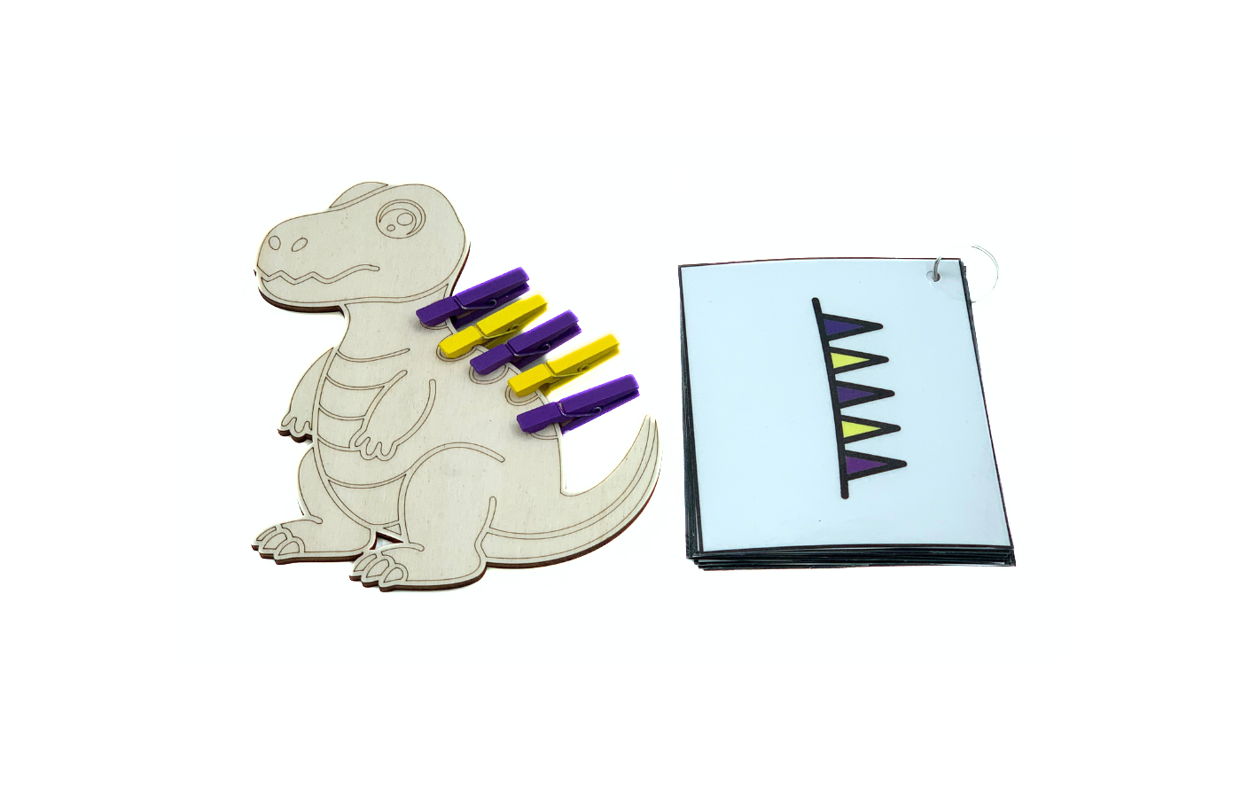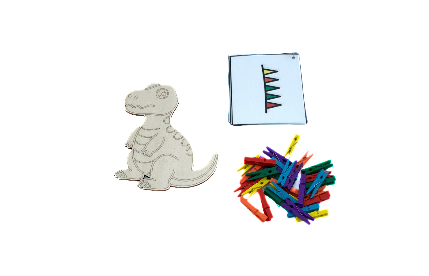 Jeu concernant l'orientation spatiale et la motricité fine. Les enfants redonnent à dinosaure ses épines avec des pinces à linge sur la base de cartes de mission. Comprend 30 petites pinces à linge colorées (rouge, jaune, vert, bleu, orange et violet).