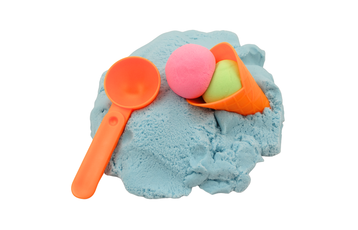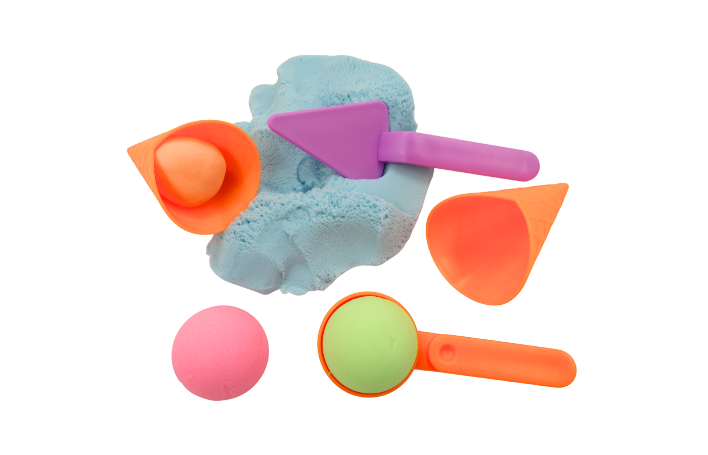 De verschillende tools nodigen uit tot experimenteren: schepjes om te vullen, vormen om af te drukken en bolletjes om te stapelen. Ideaal voor sensorisch spel, open-einde spel en fantasierijk rollenspel rond ijsjes, zomer of winkeltje spelen.