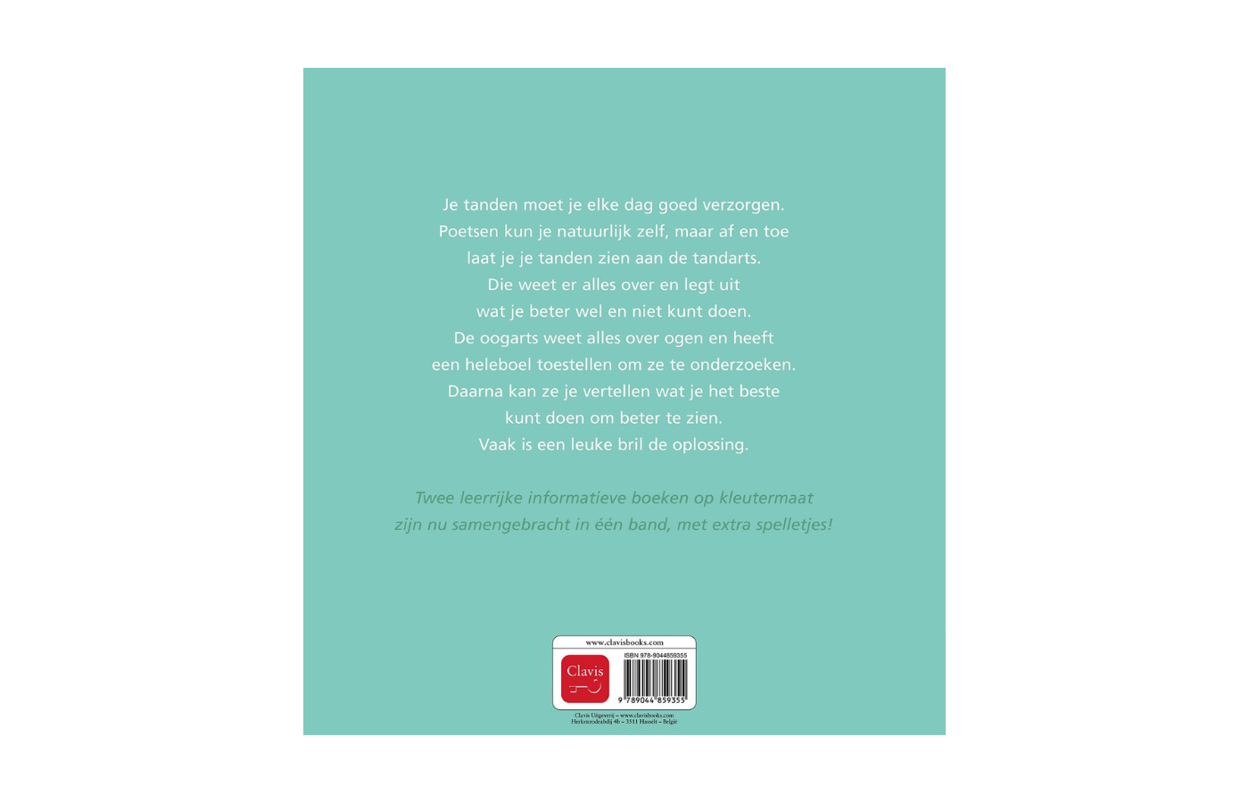 Je tanden moet je ze elke dag goed verzorgen. Poetsen kun je natuurlijk zelf, maar af en toe laat je je tanden zien aan de tandarts. Die weet er alles over en legt uit wat je beter wel en niet kunt doen. De oogarts weet alles over ogen en heeft een heleboel toestellen om ze te onderzoeken. Daarna kan ze je vertellen wat je het beste kunt doen om beter te zien. Vaak is een leuke bril de oplossing. Twee leerrijke informatieve boeken op kleutermaat zijn nu samengebracht in één band, met extra spelletjes!