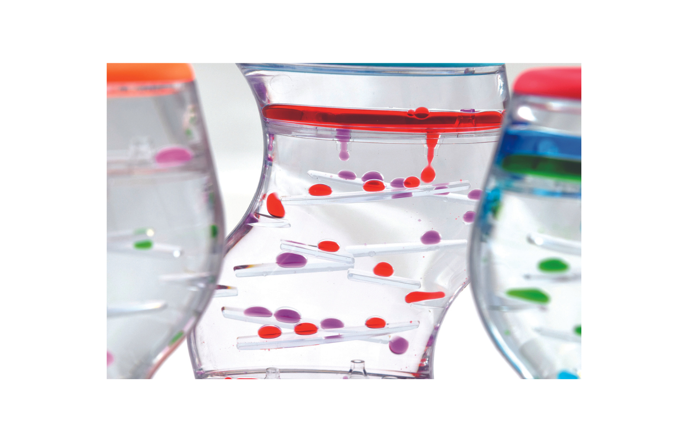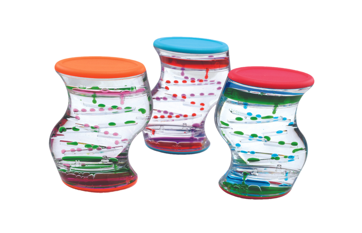 Crystal clear sensory liquid set with colorful oil and water. When turned upside down, the colored liquid (orange, red or blue) spirals to the bottom of the hourglass.