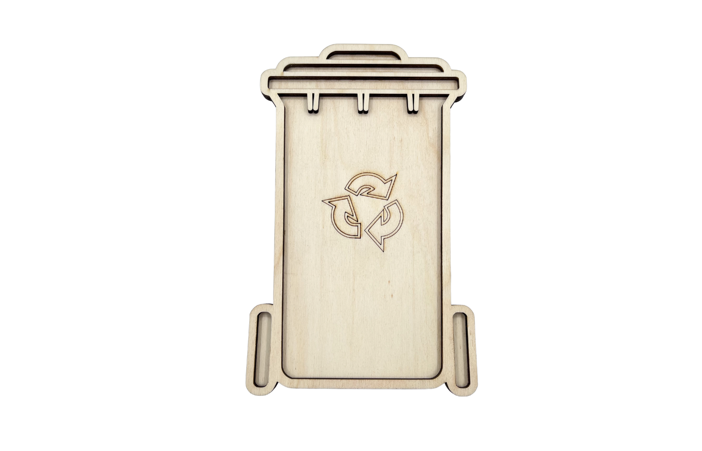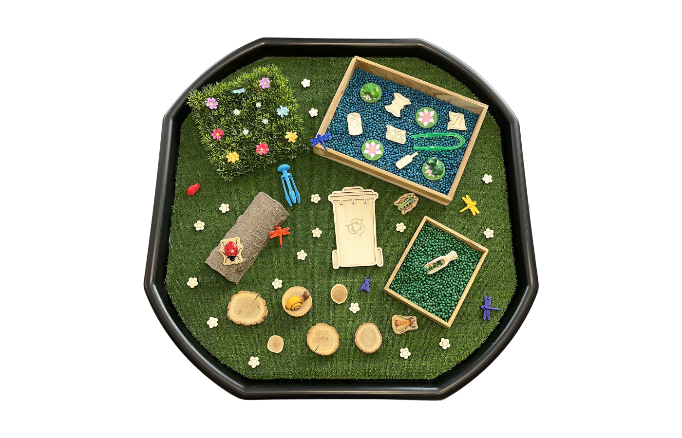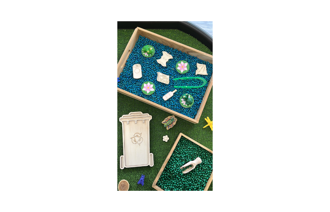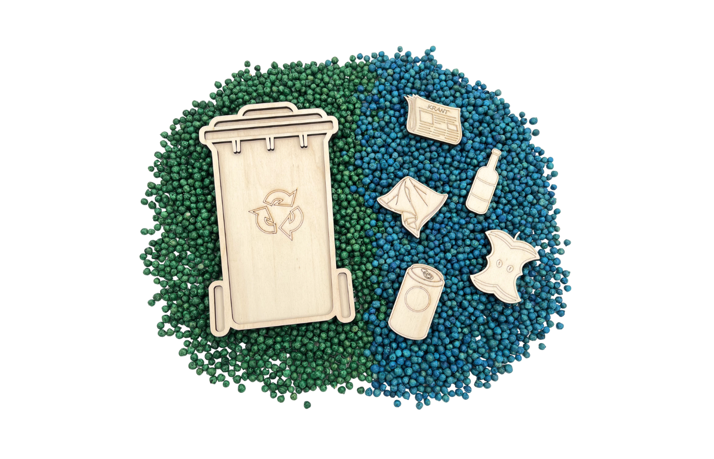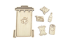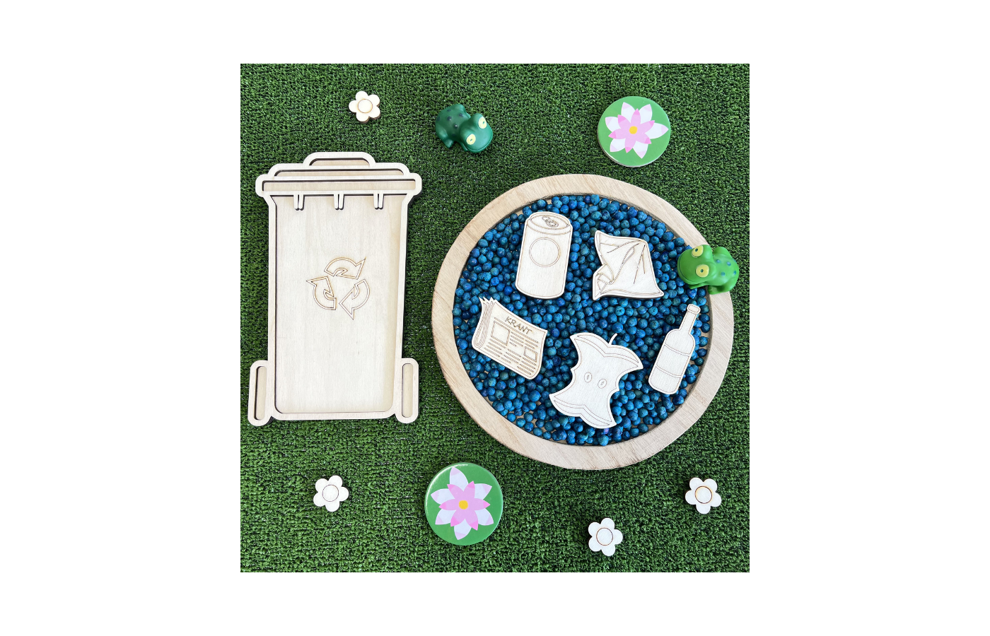 Vulvorm of speeltray in de vorm van een afvalcontainer. Perfect te vullen met droge materialen zoals speelrijst, kikkererwten, fijn zand,... . In combinatie met 5 houten spelfiguren in thema 'afval sorteren'.